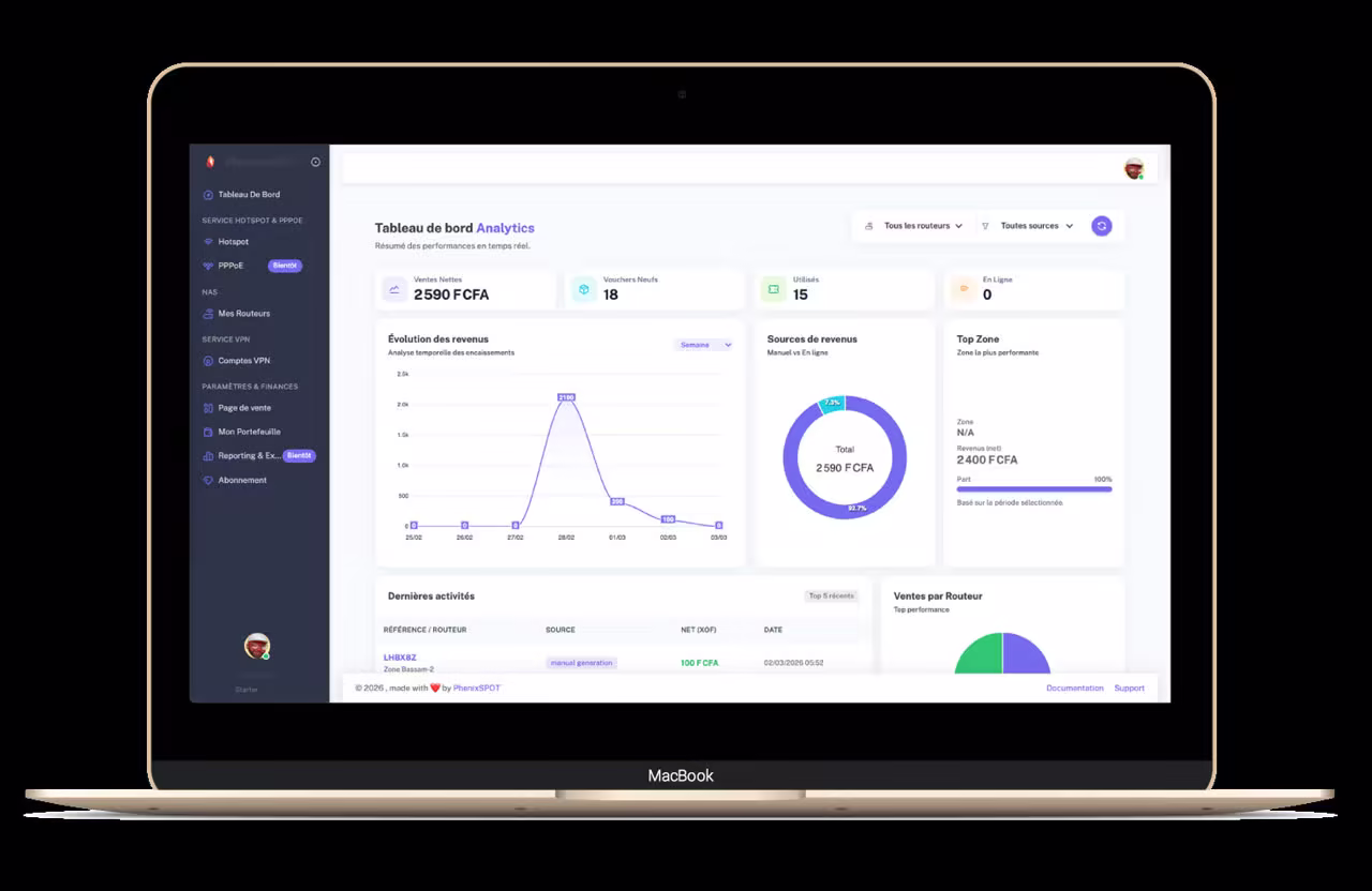Une solution professionnelle pensée pour les WISP, ISP locaux, cybercafés et intégrateurs : gestion Hotspot/PPPoE, AAA RADIUS, vouchers, portail captif, paiements Mobile Money et reporting.